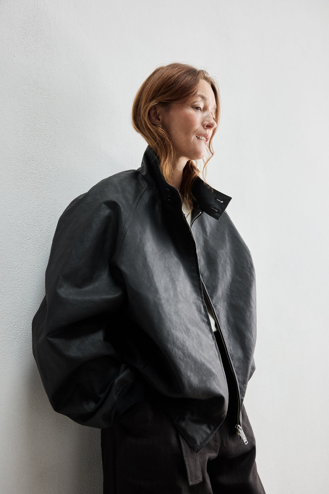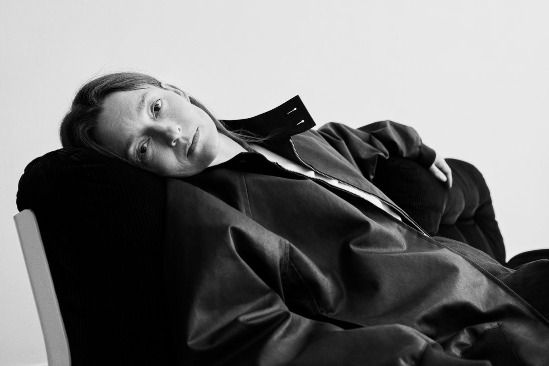 Studio Nicholsonでは、服のフィジカルな感覚や着心地を常に最重要視してきた。「肌に触れるものはとても大切。テクスチャーや手触りには徹底的にこだわっている。たとえばレザージャケットの硬い外側は、裏地や間に挟むレイヤーで、必ず柔らかさと調和させるべき」と彼女は語る。