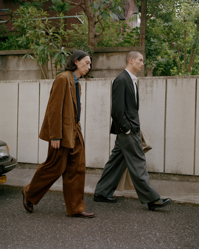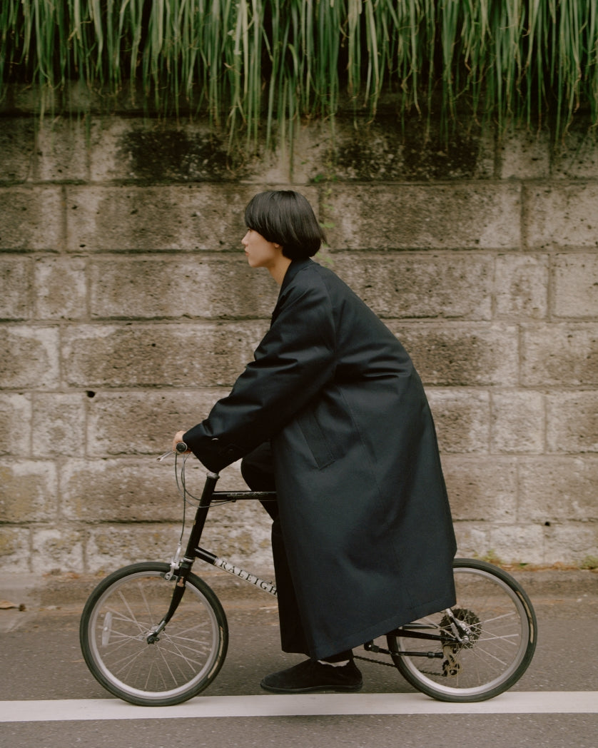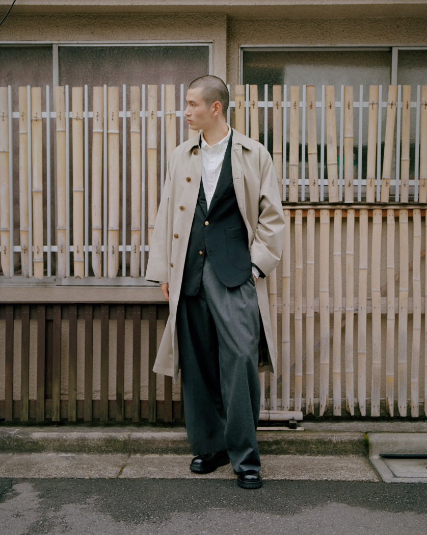 クラシックなメンズウェアが中心的な役割を担い、スタイルは再解釈され、ディテールは現代的にアップデートされています。たとえばPETERトレンチコートは、撥水性のあるギャバジンツイルを使用し、Studio Nicholson らしいシグネチャーシルエットを最大限に表現しています。日本の職人によるハンドグルー仕上げが施されたダークネイビーのコートは、ゆったりとしたテーラリングで仕立てられ、BEAMS Plus のアイビーリーグ的デザインコードを想起させる繊細なコットンポプリンのチェック裏地があしらわれています。