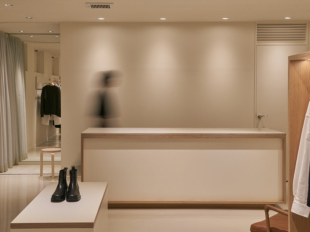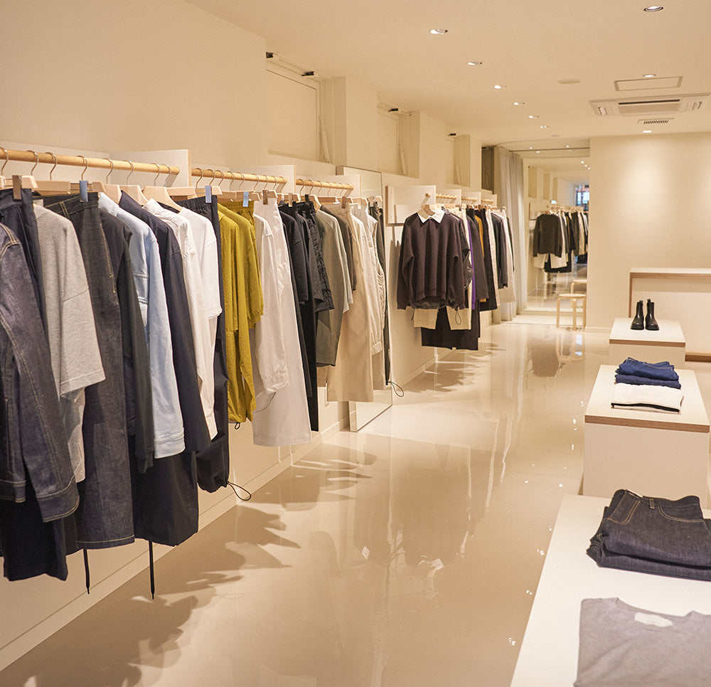 メンズとレディスウェアの全商品を取り揃える青山のフラグシップショップには、スタジオニコルソンの定番のフットウェアとアクセサリーも並びます。広々としたフロアプランでゆったりとお客様をお迎えし、スタジオニコルソンの世界を贅沢に体験できる、新たなスペースが登場しました。