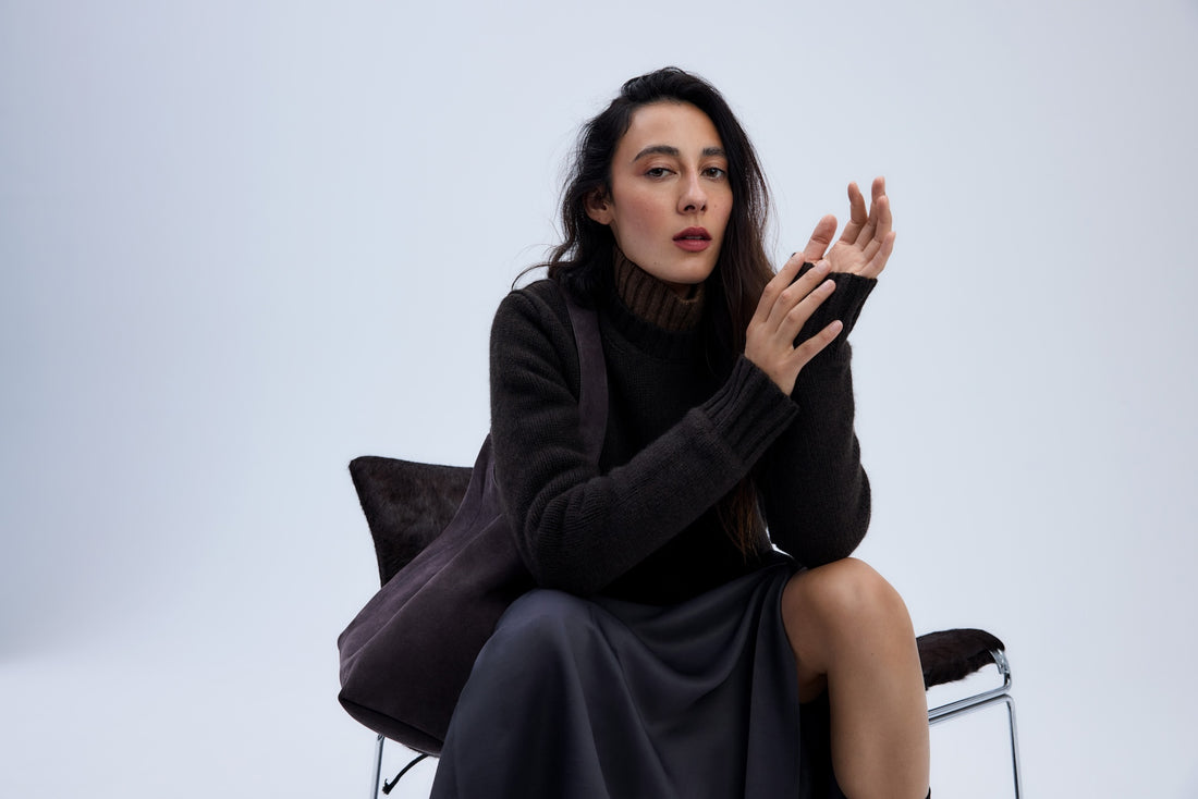 「このコレクションで特に強いテクスチャーの要素をもたらしたのは、多彩なニットの経験です」と Wakemanは述べます。「AUTUMN’2025コレクションにあるスコットランド製ニットを基盤に、秋冬コレクションではモヘアの起毛やヤク、アルパカを追加しました。柔らかなニットと、コレクションに登場するハードな素材や削ぎ落とされたテーラリングとのコントラストはとても重要です」。代表的なアイテムには、ユニセックスのMORAYダブルフェイスカシミアスウェットシャツがあります。建築的なドロップショルダーとリブディテールを備え、チャコールカラーで展開されます。また、ウィメンズではアルパカ×メリノのオーバーサイズPERSEPHONセーターがブラックとナチュラルマールで登場します。