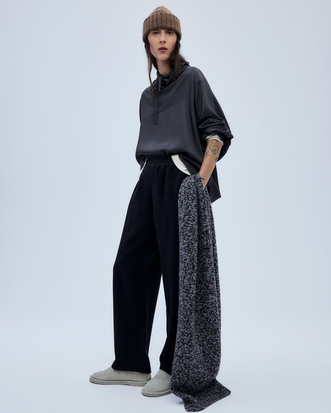 ウィメンズのその他の注目素材として、ダブルウールサブレの洗練された弾力感や、彫刻的なビスコース、ビスコースサテンがあります。ロングスリーブのCALIドレスはチョークまたはブラックのダブルウールサブレで展開され、グランジとコージーの二面性を持ちます。MIRELLEはスレートやミストで登場し、マットサテン仕上げの感触豊かなチュニックフーディーのハイブリッドです。新登場のラウンドシルエットにベルトを備えたDORINGパンツや、スラッシュネックのCATENトップは、彫刻的なビスコース素材で仕立てられ、モダンな印象を与えます。