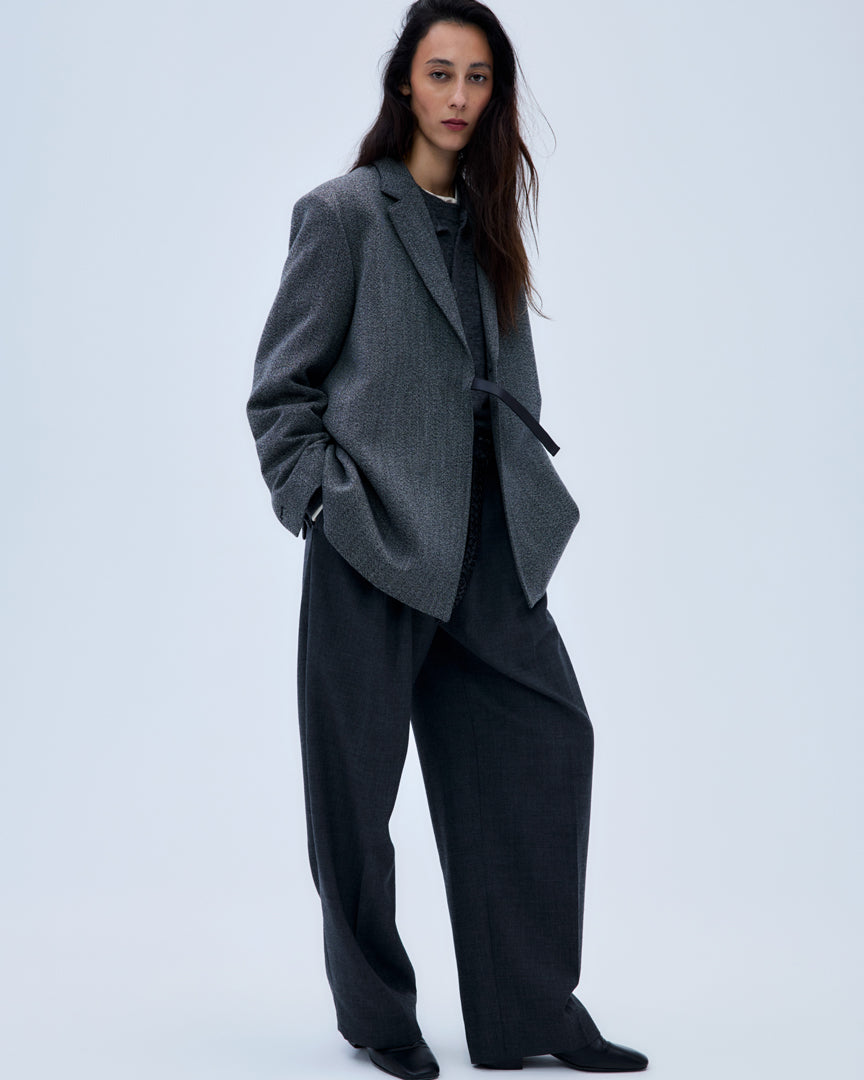 「スタイリングの観点から言えば、スカートやドレスをパンツに重ねるスタイルがキャンペーンや撮影でますます登場しています」と Wakemanは語ります。「ブランドが持つマスキュリンとフェミニンのコードを象徴しているのはもちろんですが、単なる比率の遊び以上に今らしい表現に感じられるのです」。メランジのWHEELERシャツドレスと、スリット入りのストレートレッグパンツMIRAを軽やかなトロピカルウールで合わせたスタイルは、今季のキー・ルックとなります。