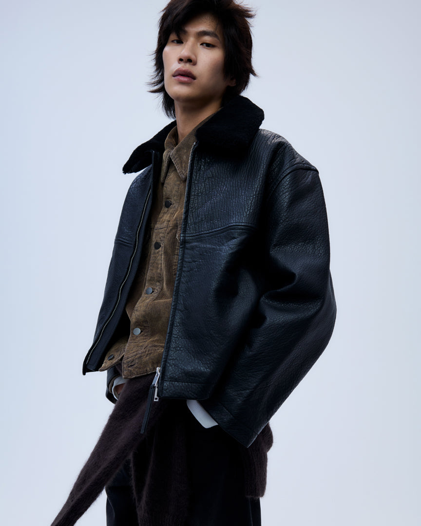メンズウェアとしてデザインされたのは、オイルカラーのコットンナイロン混マット生地で仕立てられたOVERハリントンジャケット。ブラックレザーでも展開されます。Wakeman自身も好んで着用するというお気に入りの一着です。その無骨さはタイムレスな魅力を放ちます。同様に実用性を重視したETNAジャケットは、ダブルカシミアのフーデッドウールジップスルーで、2つのレングスが用意されています。レザーコーティングされたドローコードが特徴で、「ダッフルコートを現代的に再解釈したもの。クラシックなトグル付きフードダッフルよりもハードなムードで、スポーティーです」と Wakemanは説明します。さらに、取り外し可能なシェアリング襟付きのレザージャケットERIE(ウィメンズ)とDEL(メンズ)も存在感を放ちます。