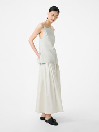 上質な素材使いとモダンなデザインを融合させたスカート。素材にはノイジーコットンを使用しており、パリッとした心地よいハリのある手触りが特徴で、生地の表情がAラインスカートのデザインを引き立てる。バックにはナイフプリーツを施していて、動きに合わせて自然な立体感とボリュームが生まれる設計。素材の魅力をより際立たせる仕上がりになっている。