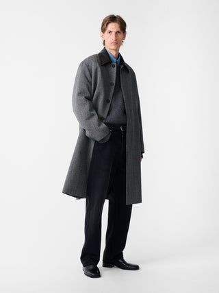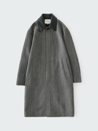 イタリア製のウール素材を使用したコート。異なる色を組み合わせ、撚り合わせることで、奥行きのある霜降り調の表情に仕上げた。洗練された印象と柔らかな肌触りが特徴的。すっきりとしたテーラード感と心地よい手触りも魅力のひとつ。膝下丈にデザインされ、柔らかなカーフレザーの襟とバックベンドで仕上げられている。