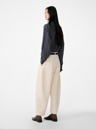 ビスコースとリネンをブレンドしたパウダーのようにきめ細かな質感とマットな肌触りが特徴のパンツ。リネンの通気性とビスコースならではの柔らかく流れるようなドレープ性が魅力。ワイドかつクロップド丈、丸みを帯びたカーブレッグと深めの股上。構築的でありながらも流動感のある、スタジオニコルソンらしいシルエットを際立てる一着。