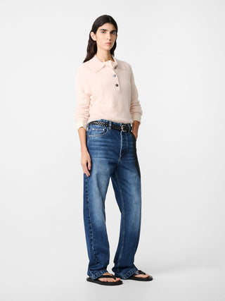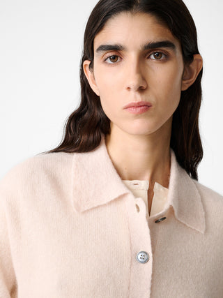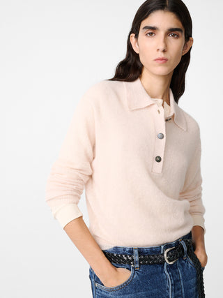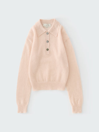 キッドモヘヤとアルパカをブレンドした生地で作ったニット。クラシックなポロシャツから着想を得た一着。柔らかく心地のよい肌触りと、毛足のある豊かな質感が特徴的。レイヤードにも最適。ロングスリーブのデザインに端正なポロカラーが施され、洗練された佇まいに仕上げた。