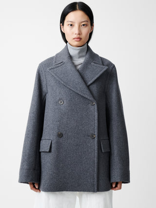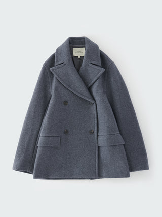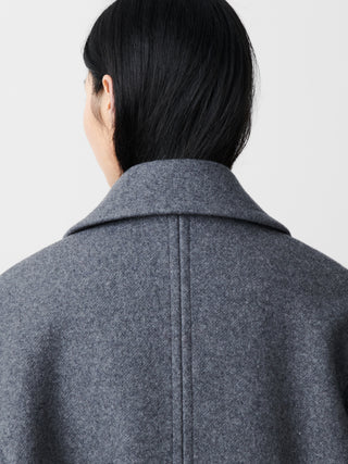 保温性に優れたリサイクルダウンウールで作られたメランジ仕立てのショートコート。ボックス型のシルエットと、ダブルブレストが特徴的。