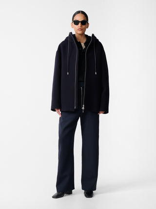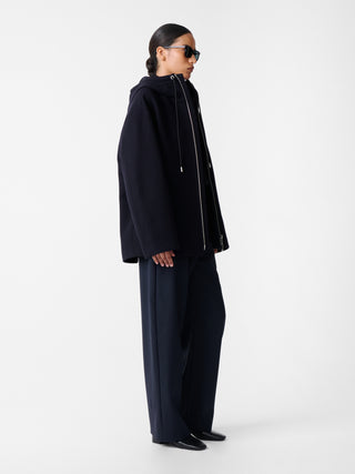イタリア製ダブルフェイスのカシミヤを使用しジャケット。適度な重みと柔らかく贅沢な手ざわりが特徴的。裏地のないフードやレザーコーティングを施したドローコード、大きめのウェルトポケットを備えている。柔らかな立体感を描く太もも丈のシルエットは、ボリュームのあるニットの上から羽織るレイヤードスタイルにも最適。