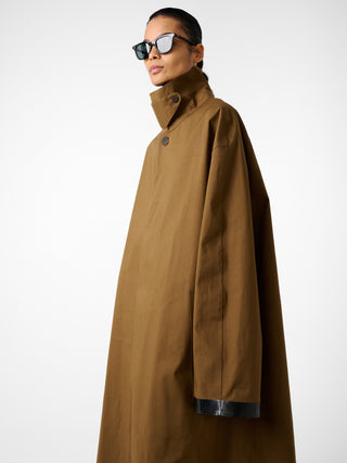 STUDIO NICHOLSONとMACKINTOSHのコラボレーションシリーズ。MACKINTOSHのシグネチャー素材であるラバー加工のボンディドコットンを使用。2枚の高品質なコットンを貼り合わせた防水性と、耐久性が特徴的。スコットランドの熟練の職人によって手作業で仕立てられた丹精込めた1着。STUDIO NICHOLSONのモダンなカッティングアプローチを想起させる、ゆったりとしたオーバーサイズシルエット、ブラックのハンドテープシームやボタンで留めるスロートガード、クラシックな膝丈も魅力。