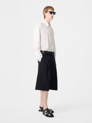 イタリア製のハイツイストコットンとナイロンのブレンド生地で作られたショート丈のパンツ。オーバーサイズにカットされ、膝下で仕上げられており、季節の変わり目に適しています。