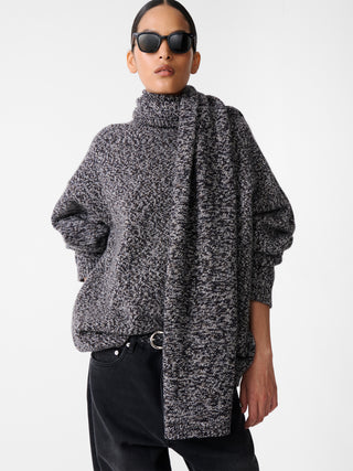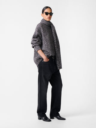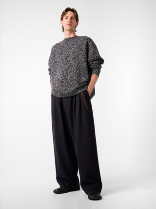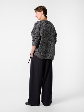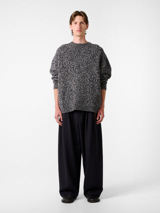 英国産ラムウールを使用し、英国の伝統的な工場で生産しているニットセーター。天然の弾力性を持ち、型崩れしにくく、伸びに強いのが特徴的。ややドロップショルダーを取り入れ、オーバーサイズフィットで仕立てられている。