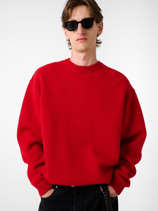 英国産ラムウールを使用し、英国の伝統的な工場で生産しているニットセーター。天然の弾力性を持ち、型崩れしにくく、伸びに強いのが特徴的。ややドロップショルダーを取り入れ、オーバーサイズフィットで仕立てられている。