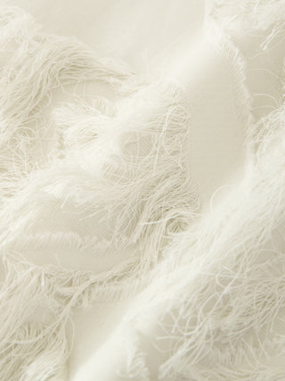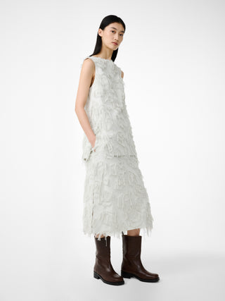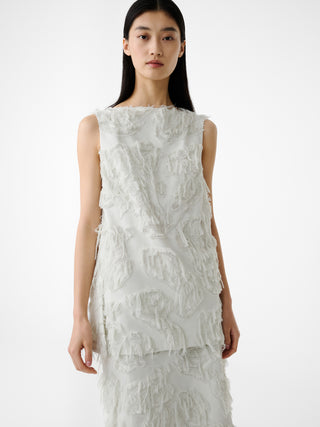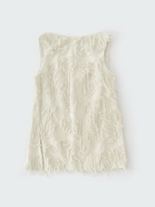 フィルクーペジャカード生地を使用したスリーブレストップス。フレンジ状の表情を持つジャカードが、奥行のある豊かなテクスチャーを生み出し、シンプルなフォルムに存在感を与えてる。ねじれを加えたサイドシームが裾のスリットへとつながる、巧みな構造が特徴。