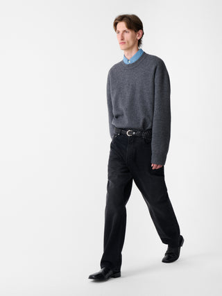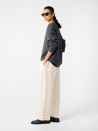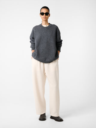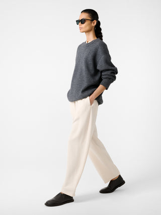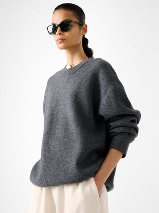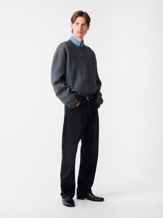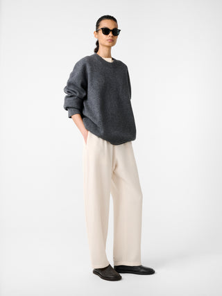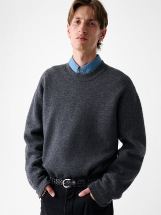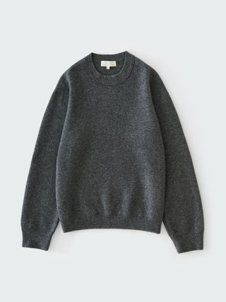 ウールとカシミヤをブレンドしたダブルカシミヤ生地を使用したクルーネックニット。贅沢な組み合わせとソフトな風合いを実現するため、丁寧に仕立てられている。クラシックで中厚の構造と洗練された仕上がりが特徴で、秋冬のレイヤリングに最適。