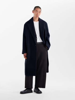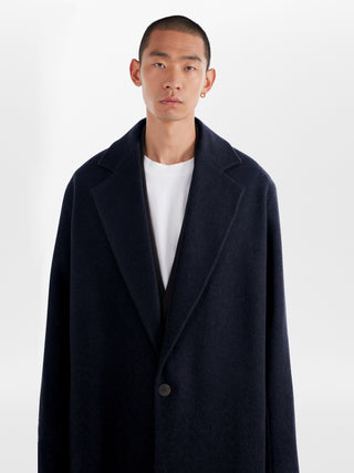 リサイクルウールメルトンを使用したドロップショルダーのオーバーコート。しっかりした素材をたっぷりと使ったコート。