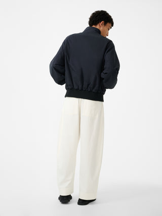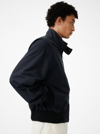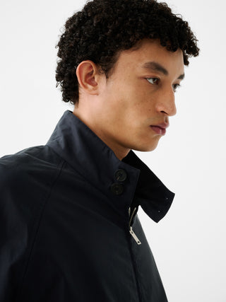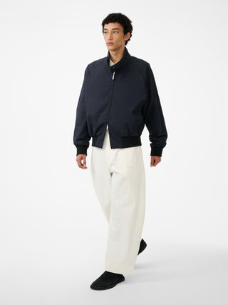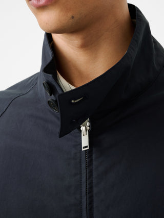 コットンとナイロンをブレンドしたマットな質感が特徴のジャケット。クラシックなハリントンジャケットをモダンに再解釈した。パウダリーでドライな手触りが魅力。撥水加工も施しており、機能面も優れている。クラシックな2ボタンのスタンドカラー、2WAYジップ、裾のエラステック仕様も特徴的。