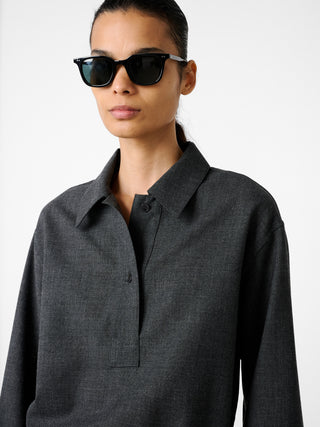 通気性とドライなシャリ感のある風合いが特徴のシャツ。ドロップショルダーとサイドシームに施された柔らかなカーブが、さりげなく流れるようなシルエットを引き立てる。