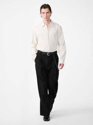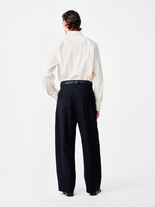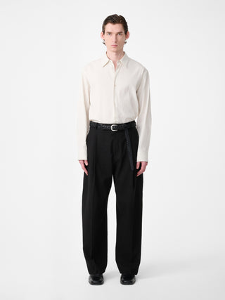 コットンとリネンのブレンド生地で作られたミッドライズパンツ。ドライでチョークのような質感の手触りと、同系色で表現された繊細なヘリンボーン柄が特徴的。通気性にも優れている。丸みのある風合いと滑らかな手触りが特徴的。