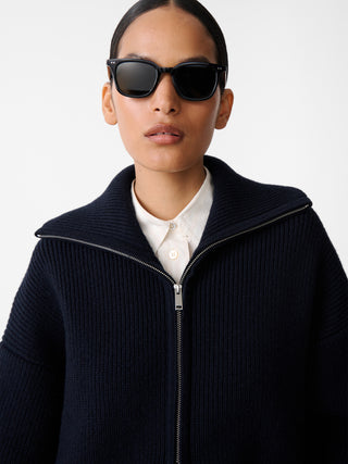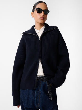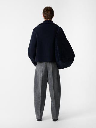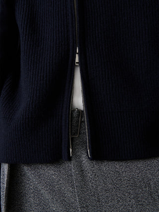 エクストラファイン・メリノウールを使用したハイネックニット。動物福祉と環境保全に配慮して生産されたウールに与えられる国際的な認証制度RWS(Responsible Wool Standard)に承認を受けたウールを使用している。柔らかな肌触りとボクシーなシルエットが特徴的。ブルゾンから着想を得たやや短めの丈感・ボクシーなシルエット・袖口のサムホール等の様々なデザインが施されている。