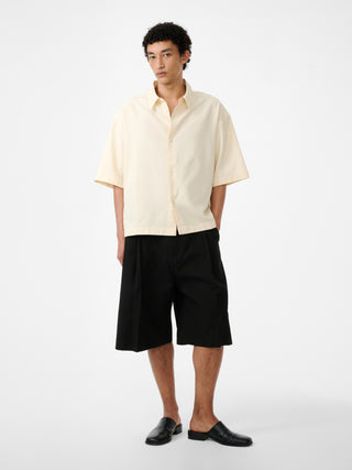 コットンとリネンのブレンド生地で作られたショートスリーブシャツ。ドライでチョークのような質感の手触りと、同系色で表現された繊細なヘリンボーン柄が特徴的。通気性にも優れている。広めの身幅とドロップショルダーによるシルエットが、リラックスした雰囲気とさりげないクールさを演出。暖かい季節に最適な軽やかな着心地のシャツ。