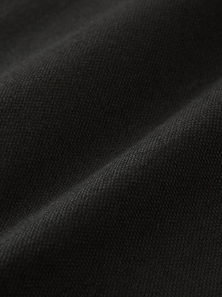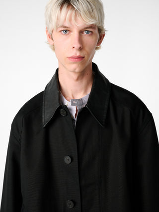 Aaron Levineとのコラボレーションアイテム。日本製のダックキャンバス(厚手で丈夫な綾織り)をパネル状に組み合わせたコットン生地を使用したジャケット。耐久性と重厚感ある手触りが特徴的。ゆったりとしたボクシーなシルエットで仕立てられ、柔らかなレザーの襟と比翼仕立てのフロントボタンで、モダンかつ洗練された印象に。