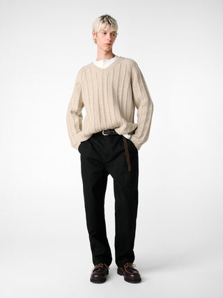 Aaron Levineとのコラボレーションアイテム。イタリアで丁寧に織り上げられたバージンウールを使用したニット。しっかりとした厚みと高密度な仕上がりが特徴的。保温性にも優れている。1950年代のスタイルを思わせる、わずかにボクシーなシルエットに仕上げられ、Vネックラインとラグランスリーブがケーブル編みの重厚な表現を一層際立たせている。