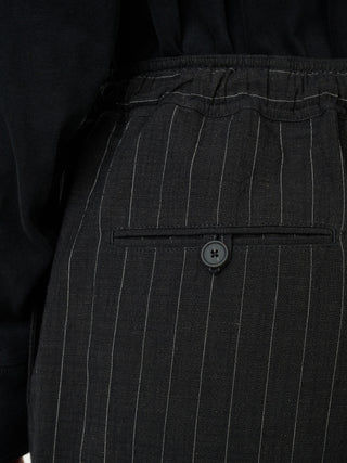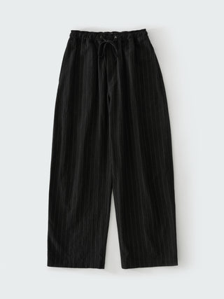 コットンとリネンのブレンド生地を使ったパンツ。クラシックなピンストライプで織られたこの素材は、ドライで程よくシワ感のある風合いが特徴で、暖かい季節の装いに、味わい深くこなれた雰囲気を与える。ドローコード付きのエラステックウエストと、緩やかにカーブを描くレッグラインが特徴で、リラックス感のある佇まいに仕上げられている。