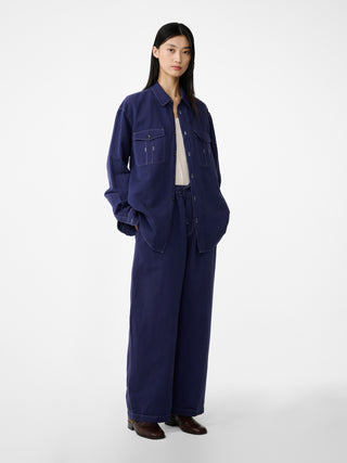 通気性に優れたコットンとリネンをブレンドした素材を使用し、製品染めを施したパンツ。一点一点奥行のある着慣れたような表情を生み出している。ドローコード付きのエラステックウエストと、緩やかにカーブを描くレッグラインが特徴で、リラックス感のある佇まいに仕上げられている。