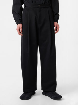 イタリア製ピーチコットンツイルを用いた、ブランド定番ボリュームパンツ。 フロントのワンプリーツやスラッシュポケット、パッチ仕様のバックポケットが特徴的。