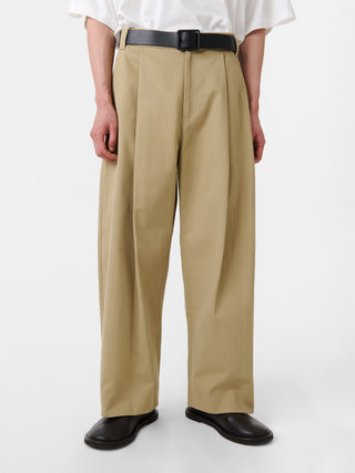 イタリア製ピーチコットンツイルを用いた、ブランド定番ボリュームパンツ。 フロントのワンプリーツやスラッシュポケット、パッチ仕様のバックポケットが特徴的。