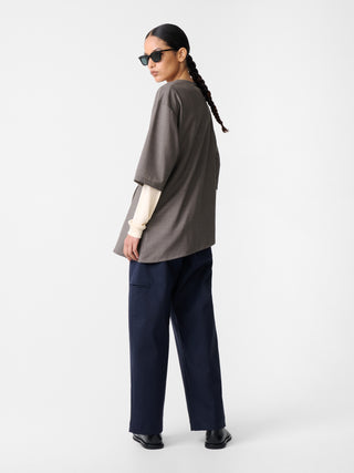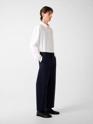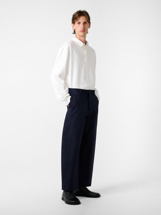 STUDIO NICHOLSONとMACKINTOSHのコラボレーションシリーズ。MACKINTOSHのシグネチャー素材であるラバー加工のボンディドコットンを使用。コーティング加工を施し、防水性と、耐久性に優れている。レッグラインを緩やかなカーブを持たせるなど、クラシックなワークウェアを想起させるディテールを随所に取り入れている。