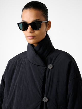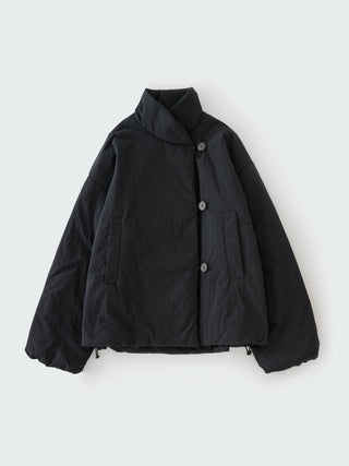テクニカルナイロン素材を使用した保温性に優れたジャケット。クラシックなミリタリースタイルを現代的にかつ洗練されたアプローチで再解釈した一着。重なり合うようなラップ風のフロントデザインと、高めに配置されたボタンが印象的。